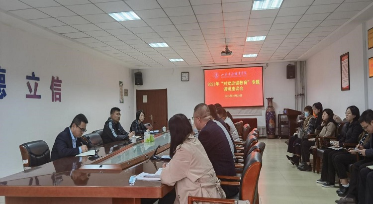 为切实推进党史学习教育高质量高标准落实落地,10月25日下午,我校在一楼会议室召开了“对党忠诚教育”专题调研座谈会,学校副校长张云生参加并主持了会议,教务处、组织人事处、宣传统战部、学生处、教师发展中心部门负责人,各二级学院分管学生副院长以及各教学院部11名教师代表参加了会议。