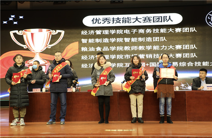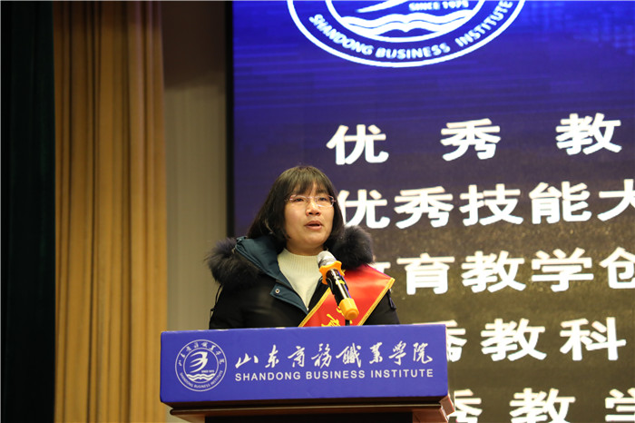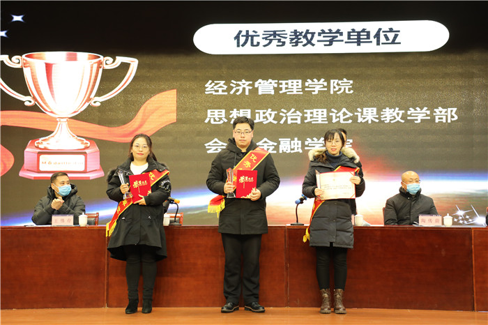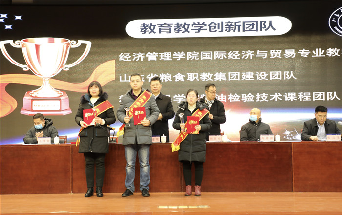 党委副书记刘艳蔚宣读了《山东商务职业学院关于表彰教学工作先进集体和优秀个人的决定》。大会颁发了优秀教学奖、优秀技能大赛团队、教育教学创新团队、优秀教科研团队、优秀教学单位五个奖项。杜延兵等18名老师获“优秀教学奖”荣誉称号;经济管理学院电子商务技能大赛团队、智能制造学院智能制造团队、粮油食品学院教师教学能力大赛团队、经济管理学院市场营销技能大赛团队、经济管理学院互联网+国际贸易综合技能大赛团队,共5个团队获“优秀技能大赛团队”荣誉称号;经济管理学院国际经济与贸易专业教学团队、山东省粮食职教集团建设团队、粮油食品学院粮油检验技术课程团队,共3个团队获“教育教学创新团队”荣誉称号;粮油食品学院粮食生物应用技术教科研团队、信息工程学院新一代信息技术教科研团队、基础教学部数学教科研团队,共3个团队获“优秀教科研团队”荣誉称号;经济管理学院、思想政治理论课教学部、会计金融学院,共3个二级学院和教学部获“优秀教学单位”荣誉称号。校领导为获奖教师颁奖。