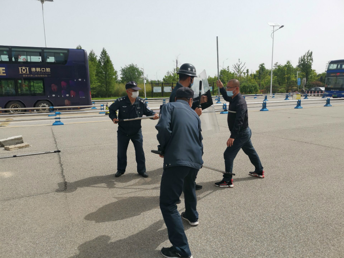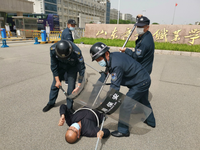 上午9时,由保安队长扮演的“歹徒”手持凶器,企图强行闯入校园,校园保安队员上前劝阻无效后,第一时间通知安全保卫处,安全保卫处立即启动《山东商务职业学院反恐防暴应急预案》,门岗人员立刻按下一键报警系统报警,并用对讲机呼叫临近岗位的保安队员前来支援,保安队员第一时间携带钢叉、防暴盾等防暴器材到达现场,采取灵活、机动的战术与“歹徒”展开搏斗,几分钟后将“歹徒”成功制服,交由公安机关依法处理。
