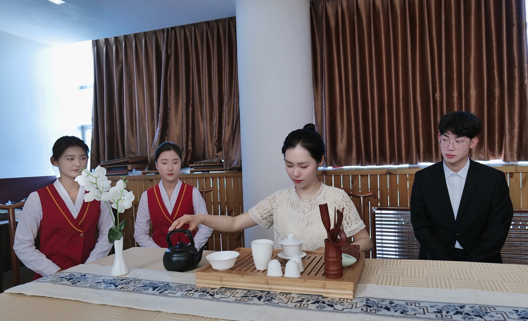 为弘扬传统文化,展示技能风采,5月15日,山东商务职业学院在传统文化实训室举办了“茶和天下 共享非遗”茶香满校园的职教周特别活动。该活动由文化旅游学院酒店管理与数字化运营专业教研室举办, 21级、22级酒店管理与数字化运营专业的全体同学积极响应,师生们品茶、论茶、切磋茶艺,茶香溢满校园,茶技赢得大家赞誉,彰显中国茶文化的内涵。